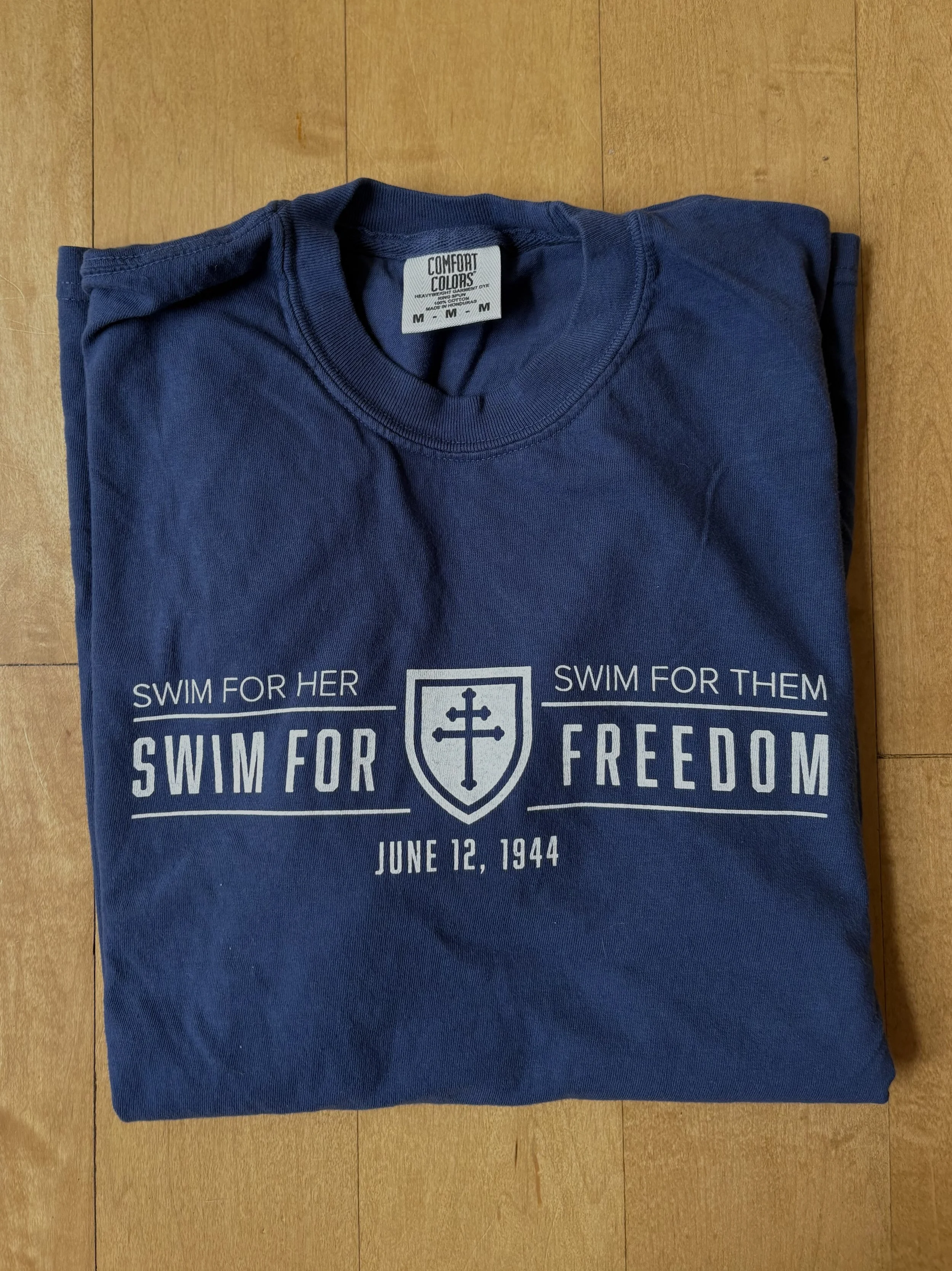 Why June 12, 1944? On this day, my Great Uncle Albert Muehlman, a Captain in the 79th Infantry Division, crossed the English Channel and landed on Utah Beach. This year, we not only swim for her but also for them, the thousands of soldiers who crossed the Channel in 1944 to secure our freedom. Our white shirt is our classic Freedom design, paying tribute to the American soldiers of the 79th who gave up their freedom for ours. The blue shirt shows the 79th’s colors—grey and blue—and their insignia, the "Lorraine Cross."
